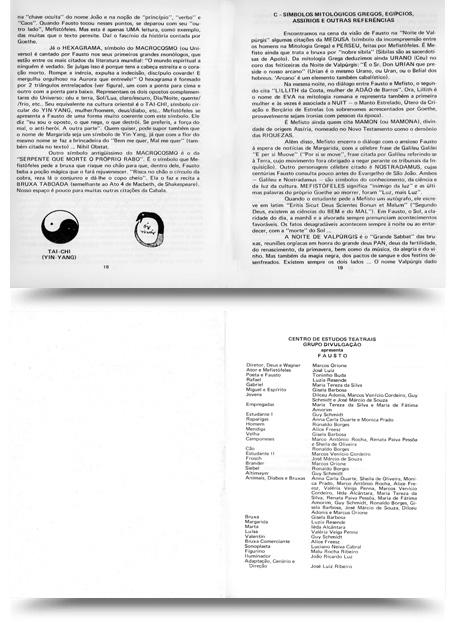 Elenco: Marcos Orione (Diretor, Deus, Wagner e Brander), José Luiz (Ator e Mefistófeles), Toninho Buda (Poeta e Fausto), Luzia Resende (Rafael e Margarida), Maria Tereza da Silva (Gabriel e Empregada), Gisela Barbosa (Miguel, Espírito, Velha e Bruxa), Dilceu Adonis (Jovem), Marcos Venício Cordeiro (Jovem e Estudante 2), Guy Schmidt (Jovem, Estudante 1, Altimayer e Valentin), José Márcio de Souza (Jovem e Frosch), Fátima Amorim (Empregada), Anna Carla Duarte e Mônica Prado (Raparigas), Ronaldo Borges (Homem, Cão e Siebel), Alice Freesz (Mendiga, Bruxa e Comerciante),