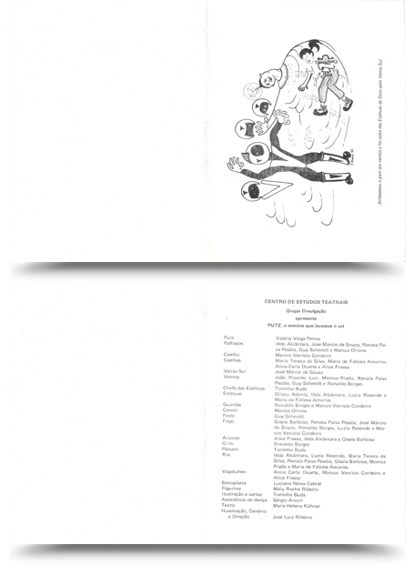 Elenco: Valéria Viega Penna (Putz), Iêda Alcântara (Palhaço, Estátua, Árvore e Rio), José Márcio de Souza (Palhaço, Vento Sul e Fogo), Guy Scmidt (Palhaço, Vento e Poste), Renata Paiva Pessôa (Palhaço, Vento, Fogo e Rio), Marcos Orione (Palhaço e Cavalo), Marcos Venício Cordeiro (Coelho, Guarda, Fogo e Vagalume), Maria Tereza da Silva (Coelha e Rio), Fátima Amorim (Coelha, Estátua e Rio), Anna Carla Duarte (Coelha e Vagalume), Alice Freesz (Coelha, Árvore e Vagalume),
