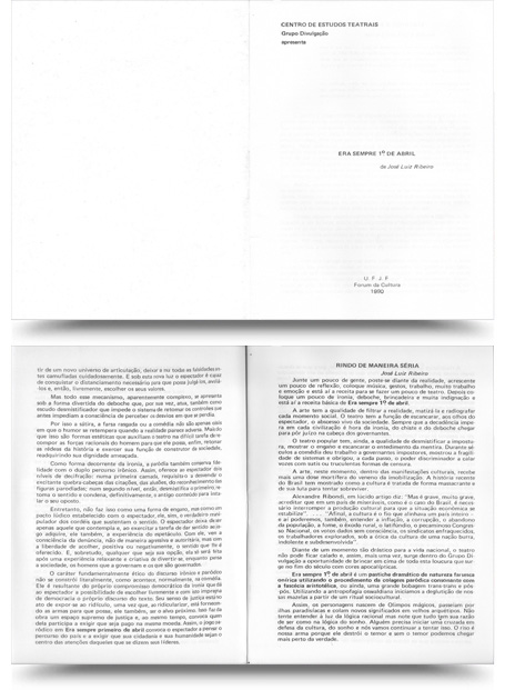 Junte um pouco de gente, poste-se diante da realidade, acrescente um pouco de reflexão, coloque música, gestos, trabalho, muito trabalho e emoção e está aí a receita para fazer um pouco de teatro. Depois coloque um pouco de ironia, deboche, brincadeira e muita indignação e está aí a receita básica de "Era sempre 1º de abril".