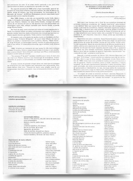 Elenco: José Luiz (Bonifácio), Luciana Vaz de Mello (Rã de Esopo, Boneca, Mulher na Taverna, Camponesa, Imaculada, Cabo Eleitoral e Rosa Ana My Fair Lady), Marise Mendes (Rã de Esopo, Mulher, Camponesa, Ilhéu, Cabo Eleitoral, Repórter e Dona Mamãe), Sandra Bastos (Rã de Esopo, Boneca, Mulher na Taverna, Camponesa, Ilhéu, Cabo Eleitoral e Velha), Augusto França (Entregador, Povo Falido, Violinista, Camponês, Ariel e Cabo Eleitoral), Cursi Jr. (Rambo e Ferrando de Além Quer), Aleyse Gramigna (Povo Falido, Luz Divina e Madame Gros Zélia), Célia Larcher (Povo Falido, Mulher na Taverna, Ilhéu, Camponesa, Cabo Eleitoral e Izildinha, Ferinha da Penha), Cláudia Saunders, Giovana Agostinho e Patrícia Biage (Povo Falido, Mulheres na Taverna, Camponesas, Ilhéus, Cabos Eleitorais e Coristinas),