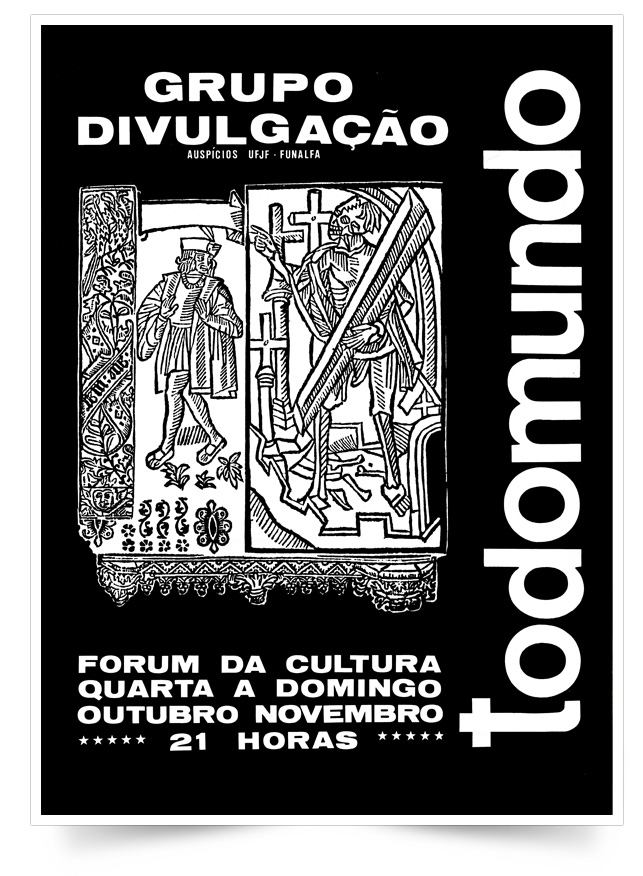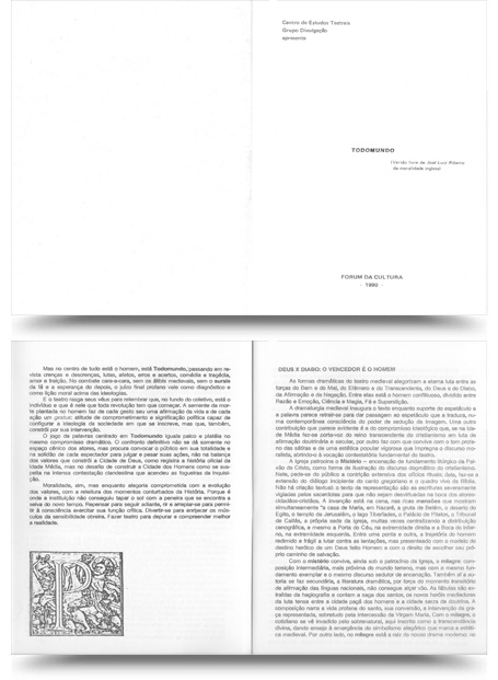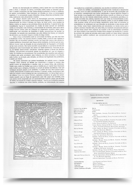 "Todomundo”, em montagem do grupo Divulgação, é um passeio sobre paradigmas medievais. A presente montagem é uma investigação plástica do cerne da dramaticidade do teatro, que se materializa a partir da luta entre a Vida e Morte.