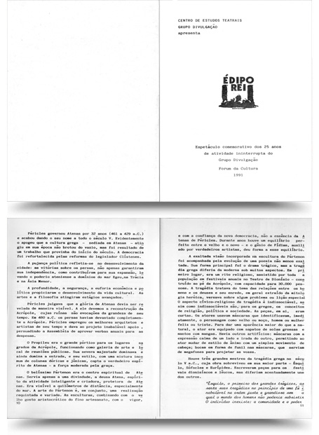 "Édipo-Rei", de Sófocles me aparece sobretudo com a tragédia da visibilidade e da busca da identidade no difícil trajeto humano de conciliação entre o saber e a experiência, entre a razão e o orgulho intelectual e o instinto, a vivência sensível acumulada. O próprio confronto Édipo – Tirésias com suas ambiguidades originárias. (...)