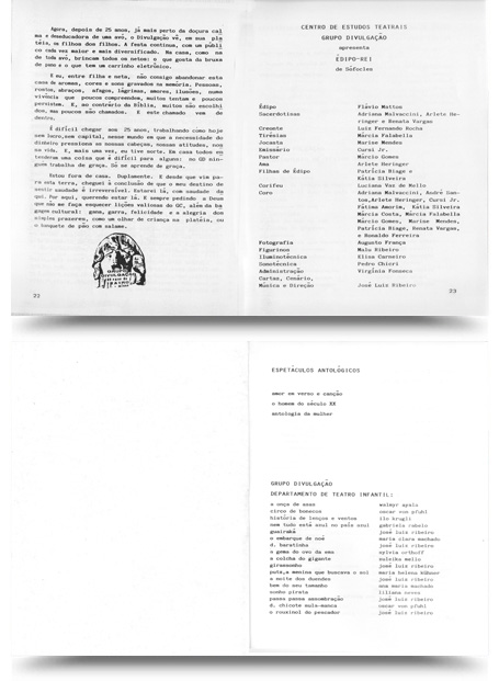 Elenco: Flávio Mattos (Édipo), Adriana Malvaccini e Renata Vargas (Sacerdotisas e Coro), Arlete Heringer (Sacerdotisa, Coro e Ama), Luiz Fernando Rocha (Sacerdotisa, Coro e Ama), Márcia Falabella (Tirésias e Coro), Marise Mendes (Jocasta e Coro), Cursi Jr. (Emissário e Coro), Márcio Gomes (Pastor e Coro), Patrícia Biage e Kátia Silveira (Filhas de Édipo e Coro), Luciana Vaz de Mello (Corifeu), André Santos, Márcia Costa e Ronaldo Ferreira (Coro)